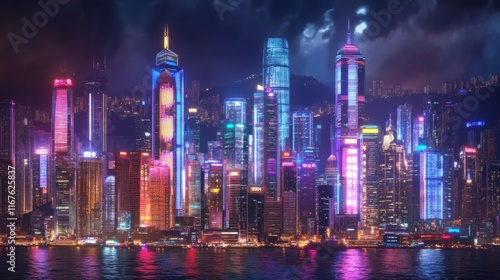 © AmStock, Obraz premium Vibrant City Landmarks at Night with Diffused Lighting