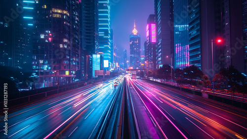 © Sajib, Fototapeta premium Vibrant city lights illuminate a busy highway at night in a modern urban landscape