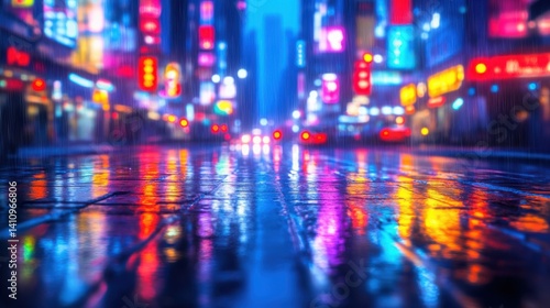 © Fightstar, Obraz premium Vibrant city lights reflected on a rain slicked street at night