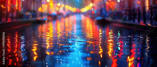 © Starkreal, Obraz premium Vibrant City Lights Reflecting on Calm Water Surface