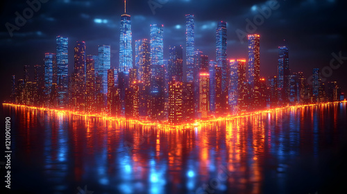 © Eos, Obraz premium Vibrant City Nightscape with Glowing Skyscrapers Reflected in Water