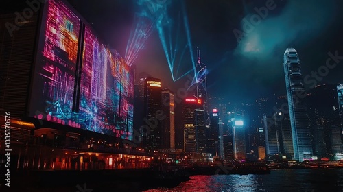 © Timeless Touch, Naklejka premium Vibrant City Nightscape with Neon Lights and Laser Beams Emitting over Urban Skyline in Hong Kong