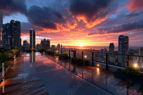 © YouraPechkin, Fototapeta premium Vibrant City Rooftop at Sunset After Rain