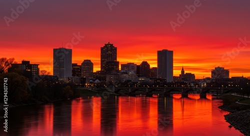 © IbragimovN, Fototapeta premium Vibrant city skyline against a stunning red sunset reflecting in a river