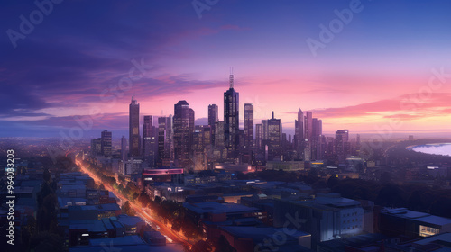 © evening_tao, Fototapeta premium Vibrant City Skyline at Dusk
