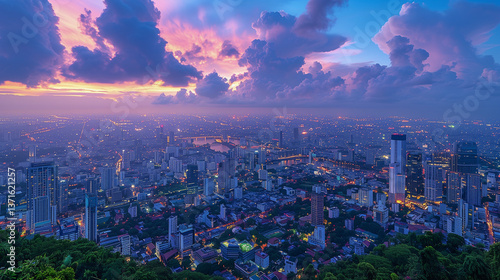 © xeionise, Fototapeta premium Vibrant city skyline at dusk with glowing clouds