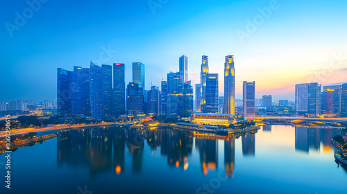 © wannapong, Naklejka premium Vibrant City Skyline at Dusk with Reflections