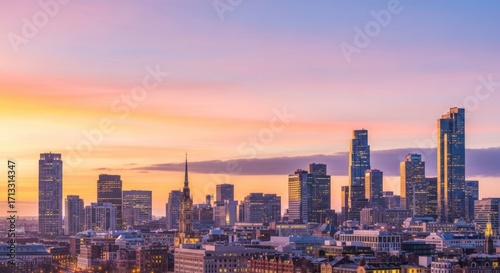 © Studio, Fototapeta premium Vibrant City Skyline at Golden Hour: Modern Skyscrapers and a Historic Spire Against a Colorful Sky