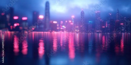 © Michael, Obraz premium Vibrant city skyline at night reflecting colorful lights on water surface
