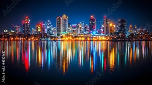Fototapeta premium Vibrant city skyline at night reflecting on calm waters, showcasing modern...