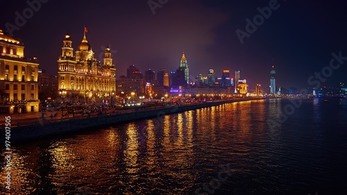 © Kitta Studio, Obraz premium Vibrant city skyline at night, showcasing illuminated buildings along the waterfront, reflecting in the water for a stunning view.