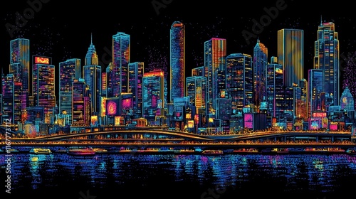 © boztaga, Obraz premium Vibrant city skyline at night with colorful lights reflecting on the water.