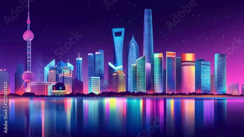 Fototapeta premium Vibrant City Skyline at Night with Colorful Neon Lights and Reflections