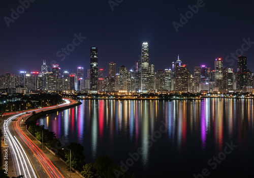 © Madiha, Fototapeta premium Vibrant city skyline at night with dazzling lights reflecting on calm water and light trails on highway