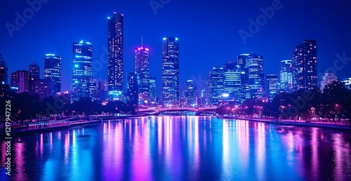 © riyan kusuma, Naklejka premium Vibrant city skyline at night with illuminated buildings reflecting on the river