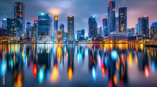 Obraz premium vibrant city skyline at night, with illuminated skyscrapers reflecting in a...