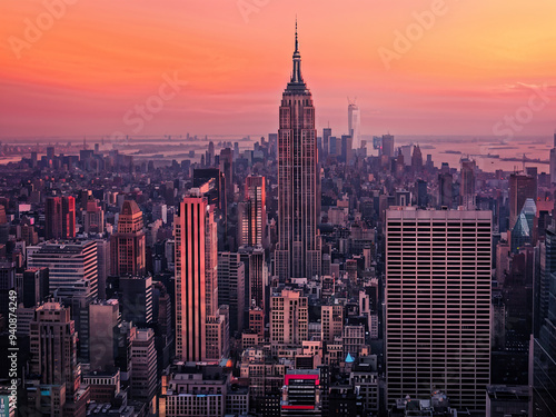 © Alsama Jepa, Naklejka premium Vibrant city Skyline at Noon with Orange and Pink Sky Background.