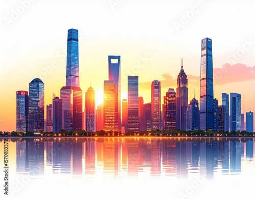 © Visioner, Fototapeta premium Vibrant City Skyline at Sunrise with Water Reflection