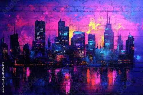 © Thedinindu, Obraz premium Vibrant city skyline at sunset, depicted in a graffiti-style painting on a brick wall.