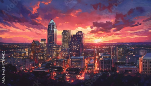 Fototapeta premium Vibrant city skyline at sunset, illuminated by warm hues.