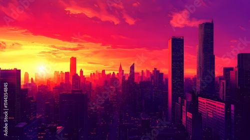 Fototapeta premium vibrant city skyline at sunset, perfect for promotional text overlays, exuding urban innovation and excitement.