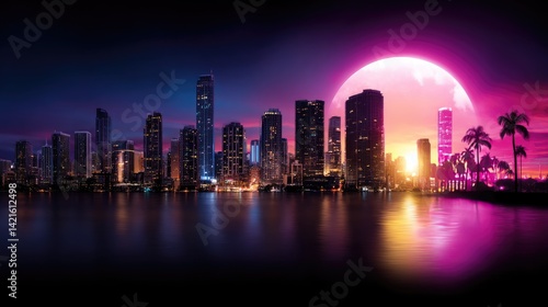 Fototapeta premium Vibrant city skyline at sunset with a surreal moonrise
