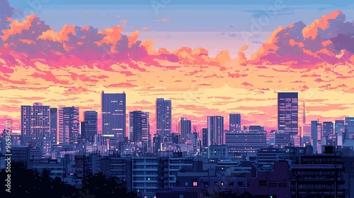 © Ben Kuang, Fototapeta premium Vibrant city skyline at sunset with colorful clouds and modern architecture.