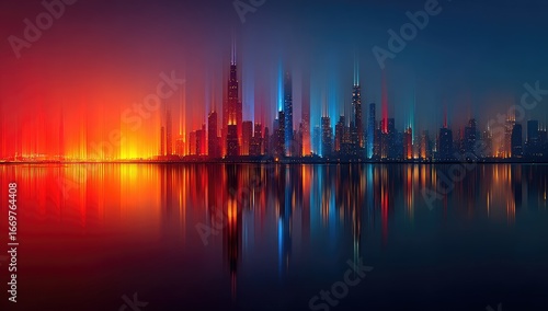 © Almarkha, Fototapeta premium Vibrant city skyline at twilight, reflected in still water
