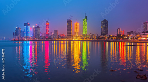 Obraz premium Vibrant City Skyline at Twilight with Colorful Reflections on Water