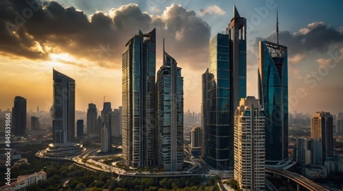 © Zyariss, Fototapeta premium Vibrant city skyline glowing under a sunset sky.