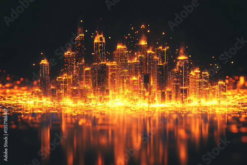 Fototapeta premium Vibrant city skyline illuminated by fiery lights reflecting on calm water at...