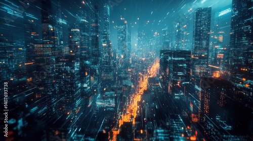 © Terablete, Fototapeta premium Vibrant city skyline illuminated with colorful lights during nighttime