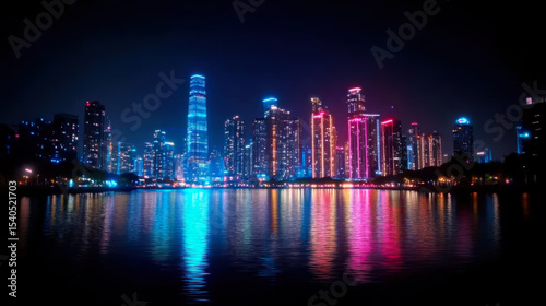 © khemthong, Fototapeta premium vibrant city skyline illuminated with colorful lights reflecting on water