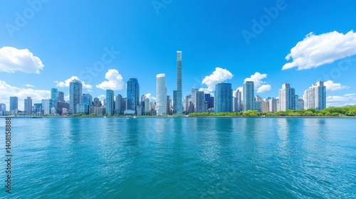 Naklejka premium Vibrant City Skyline Reflected in Calm Water Under Blue Sky