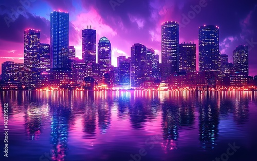 © Adama, Fototapeta premium Vibrant city skyline reflected in tranquil water