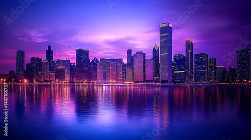 Fototapeta premium Vibrant city skyline reflected in tranquil water at twilight.