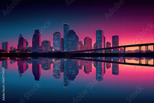 © Berkah, Fototapeta premium Vibrant city skyline reflected in water at dawn