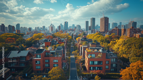 Obraz premium Vibrant city skyline showcasing modern buildings amidst autumn foliage in an...