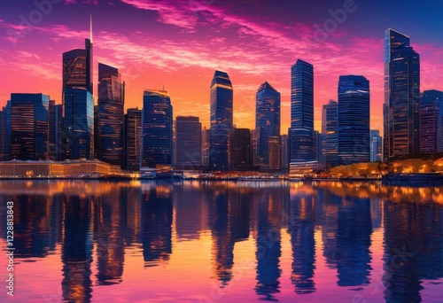 © Yaroslava, Naklejka premium vibrant city skyline twilight reflections over water surfaces illuminated buildings creating colorful nightscape elements, architecture, cityscape, urban