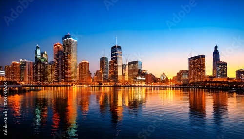 Fototapeta premium Vibrant city skylines at dusk with skyscraper and building lit up in warm tones against.