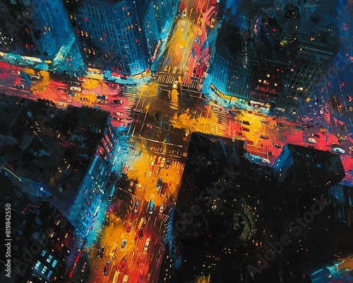© Noppakun, Obraz premium Vibrant City Street at Night Abstract Painting