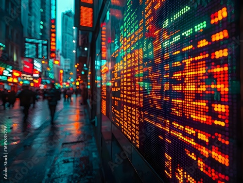 © Bussakon, Obraz premium Vibrant city street at night illuminated by glowing digital screens displaying financial data and reflecting on wet pavement