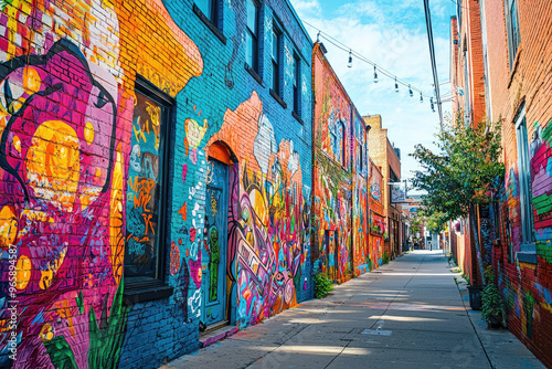 Fototapeta premium Vibrant city street featuring colorful murals and art installations,...