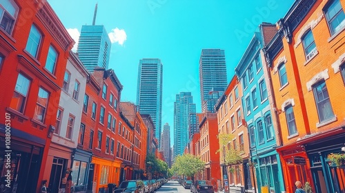 © arsyi_06, Obraz premium Vibrant city street with colorful buildings and skyscrapers.