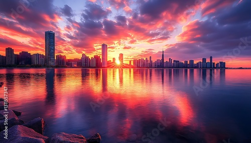 © Ardhana, Fototapeta premium Vibrant city sunrise reflected in calm water.