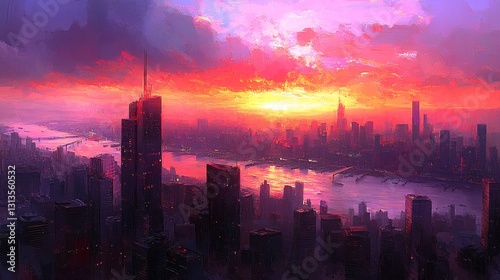 © Artajar, Fototapeta premium Vibrant city twilight abstract painting urban skyline sunset or sunrise scenic views architecture background modern art and illuminated