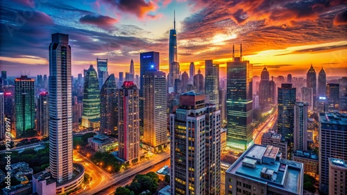 Obraz premium Vibrant cityscape at dusk featuring a sprawling metropolitan skyline with towering skyscrapers, neon lights, and bustling streets devoid of human presence.