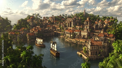 © nataliya_ua, Fototapeta premium Vibrant cityscape at dusk, featuring glowing buildings reflected in water, dramatic sky, and warm lighting perfect for travel or urban themes.