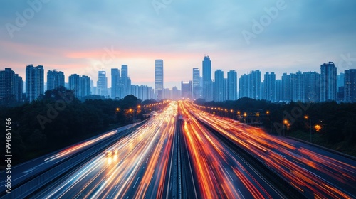 Fototapeta premium Vibrant cityscape at dusk showcases dynamic traffic streams and towering...