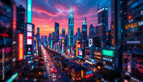 Fototapeta premium Vibrant cityscape at dusk urban center gigapixel cgi nighttime aerial view...